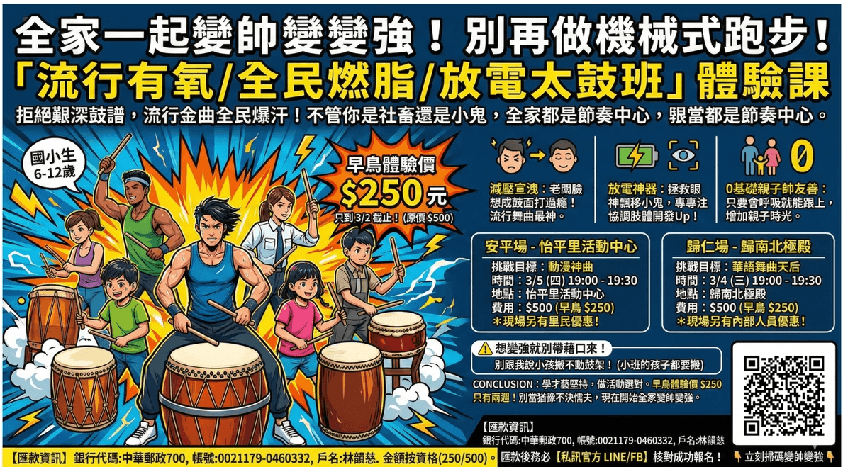 兒童太鼓班:為國小以上的孩子,訓練專注力與自信心,還有提升反應能力。